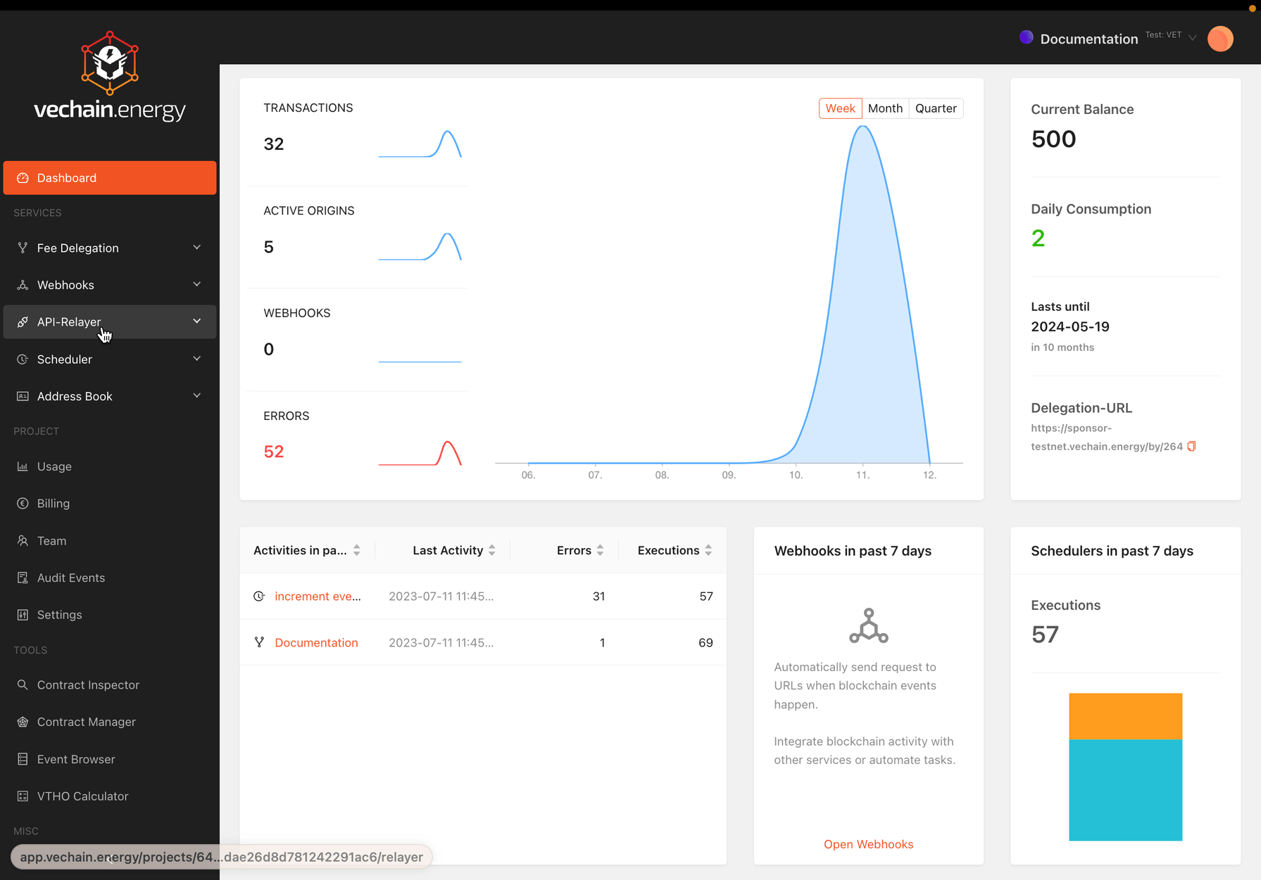 vechain.energyRelayer / API-KeysHow to SetupSetup a Transaction-API-Relay Create API-Key Creating an API key requires a title and locally storing the API key secret. The secret is not stored online and cannot be retrieved later. API keys are activated instantly. What is a Relay?Request