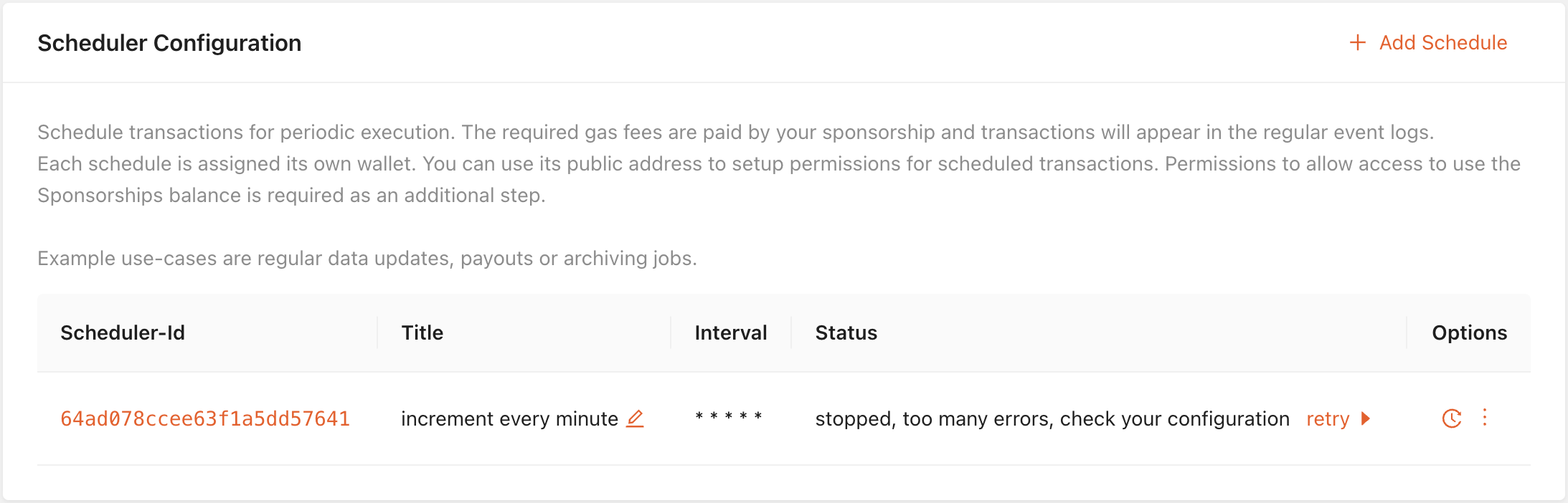 After several consecutive failures to broadcast a transaction, the Scheduler will pause automatically.