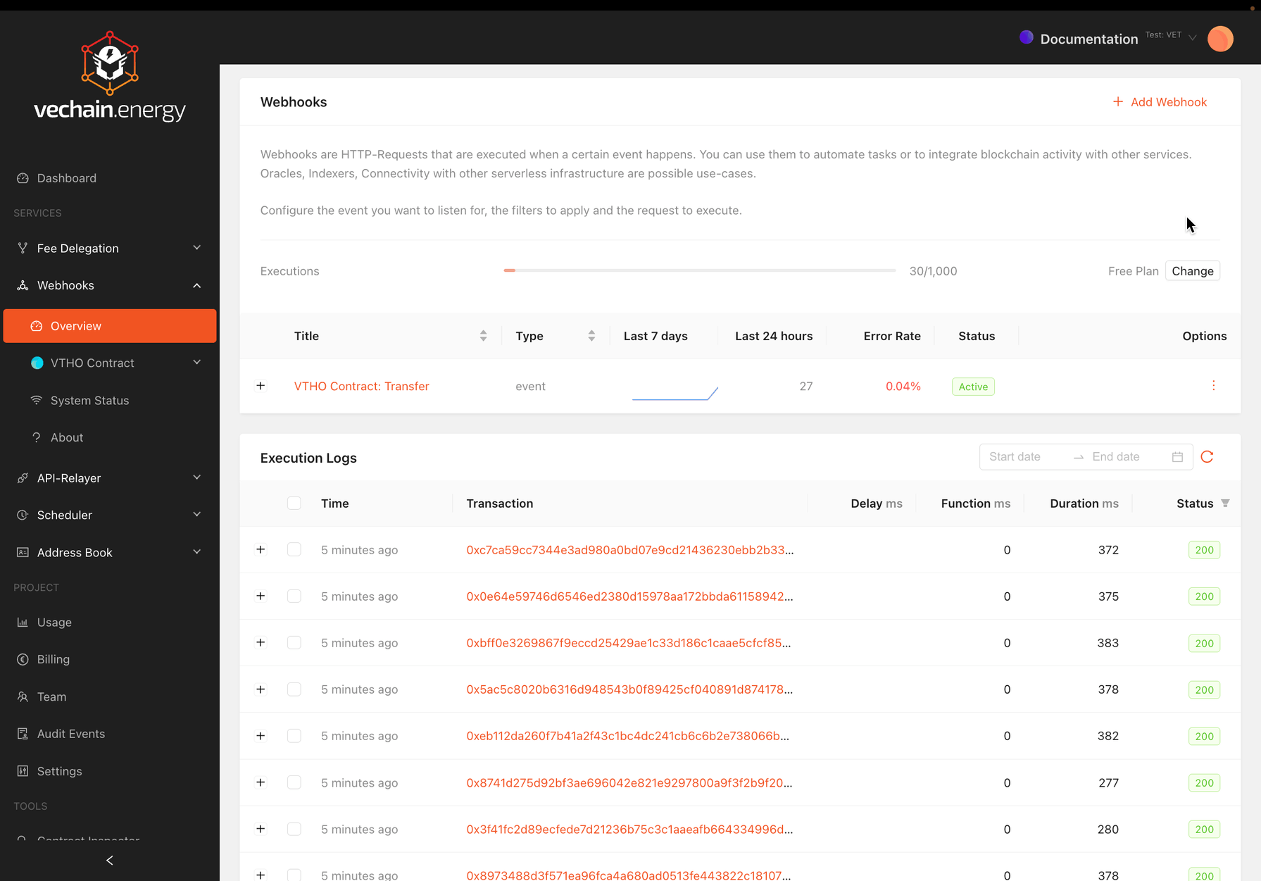 vechain.energyWebhooksPaid PlanPaid Plan The paid plan increases the maximum number of executions and enables the "Webhook Functions" feature. Payment is handled by a payment party provider and can be managed in the Billing section. TypesDebugging