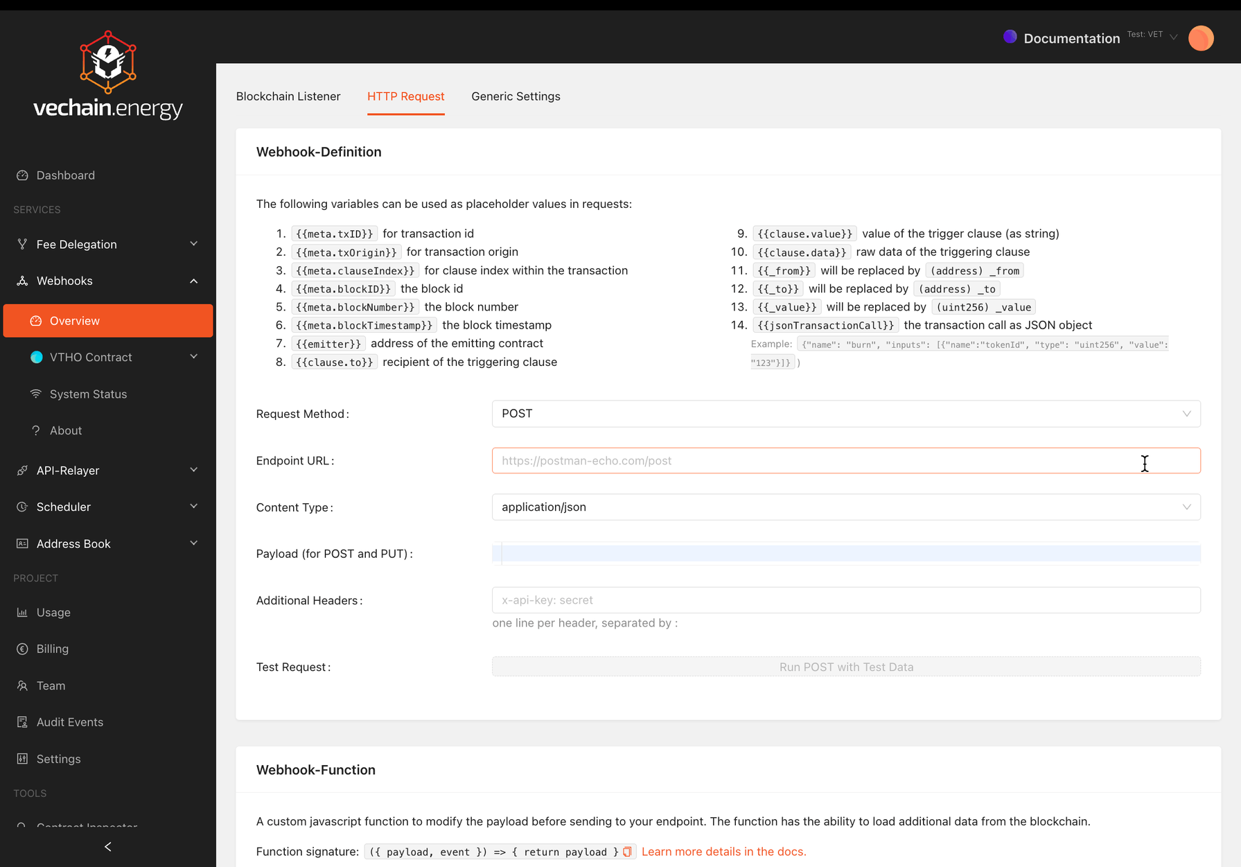 To ensure the configuration is correct, a test request can be sent. The test will use the previously entered transaction details and send it to the the configured endpoint.